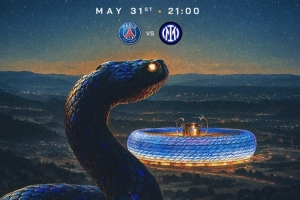 意甲官方社媒发布了为此役制作的海报,蓝蛇以及本场决赛举办地安联球场、欧冠奖杯出镜。